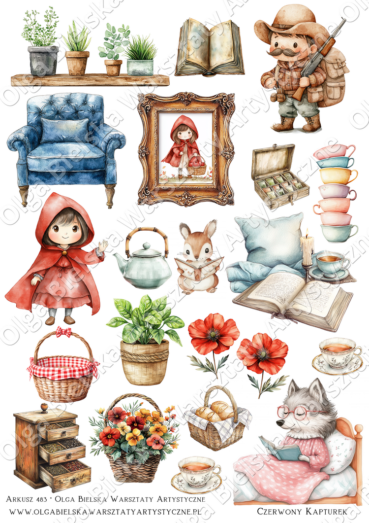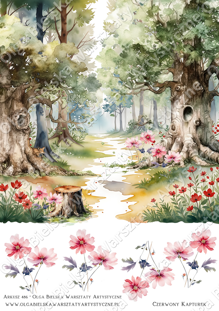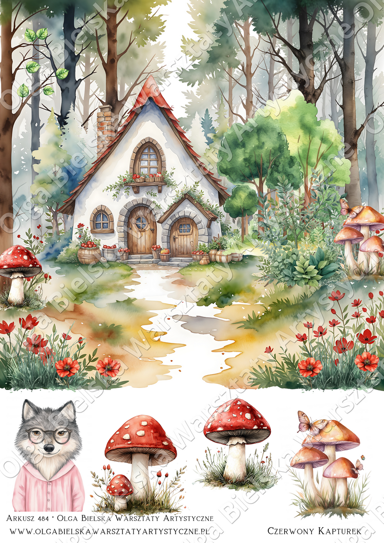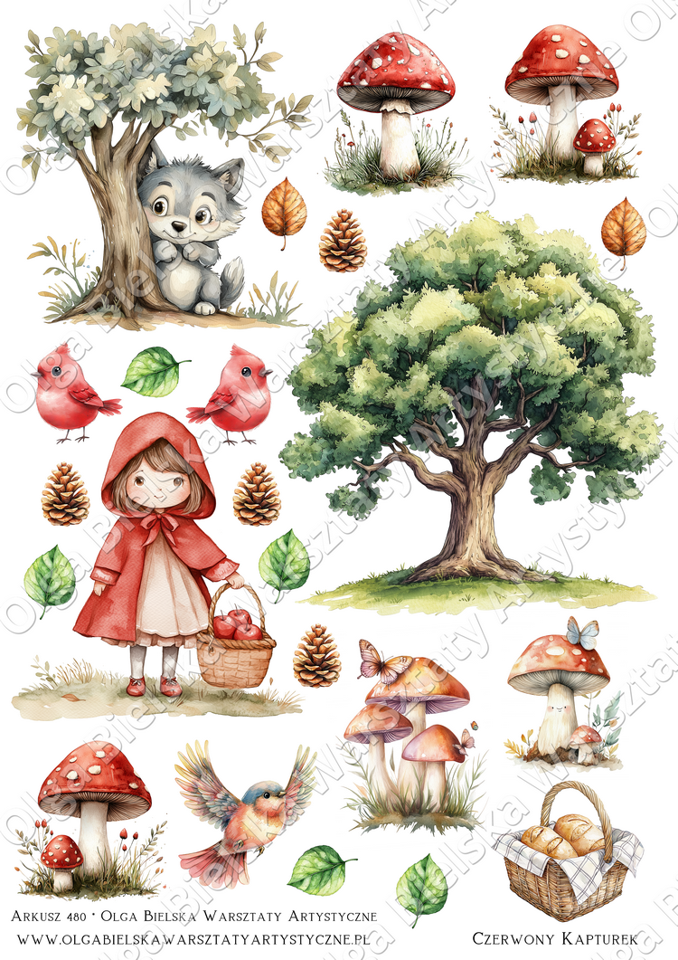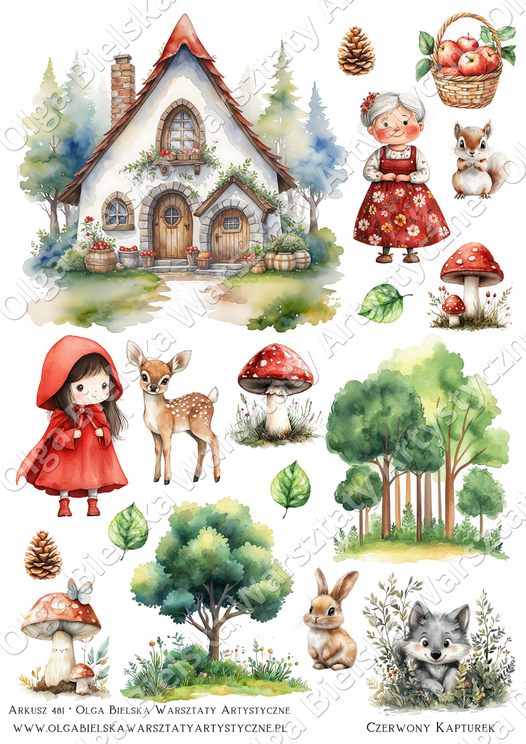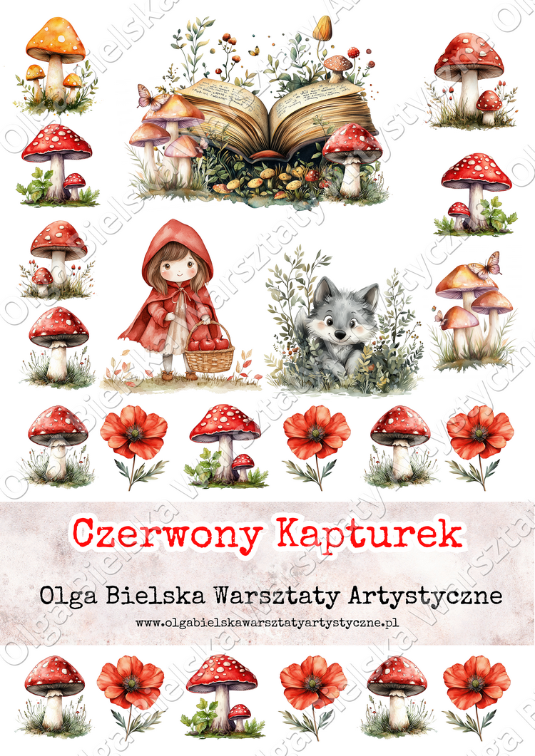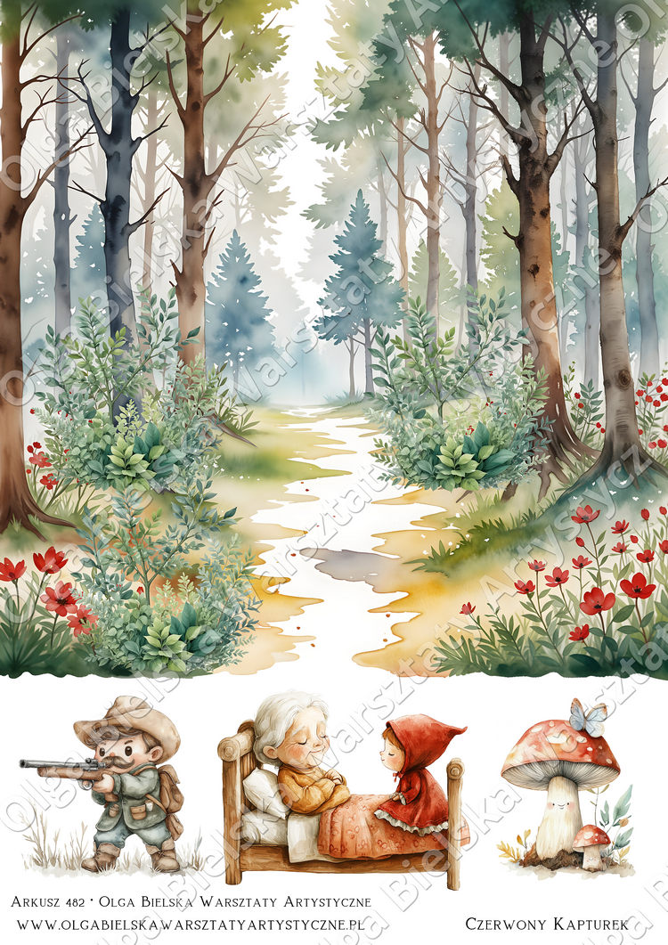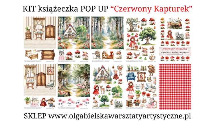 Kolekcja papierów do wykonania książeczki POP UP "Czerwony Kapturek" zaprojektowana przez Olga Bielska Warsztaty Artystyczne