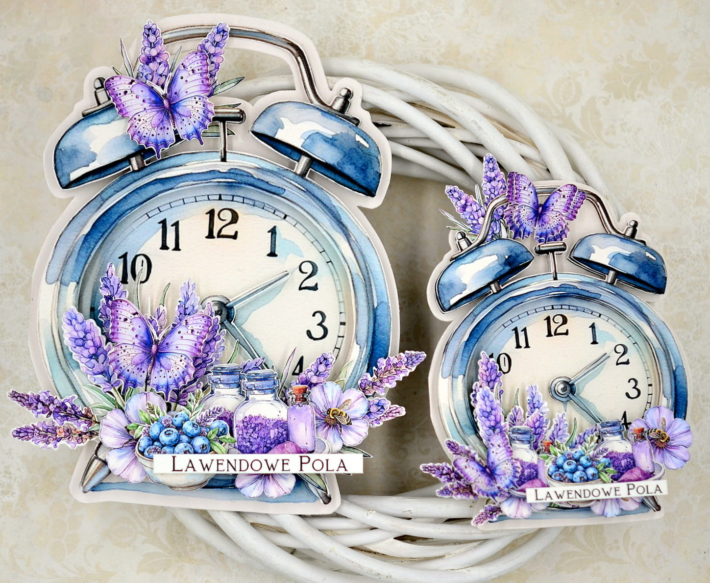 arkusz wycinanek jednostronny nr 460 kolekcja Lawendowe Pola -budzik 3D duży, shadow box, shaker