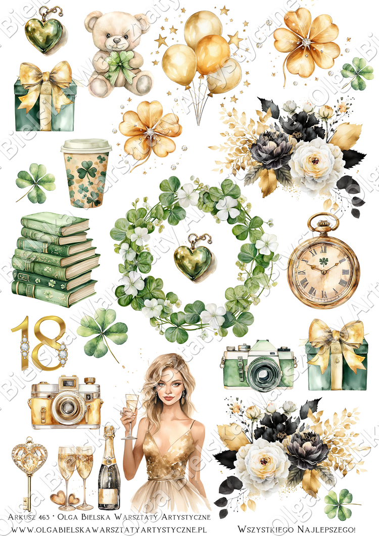 arkusz wycinanek nr 463 urodziny, czterolistna koniczyna, na szczęście