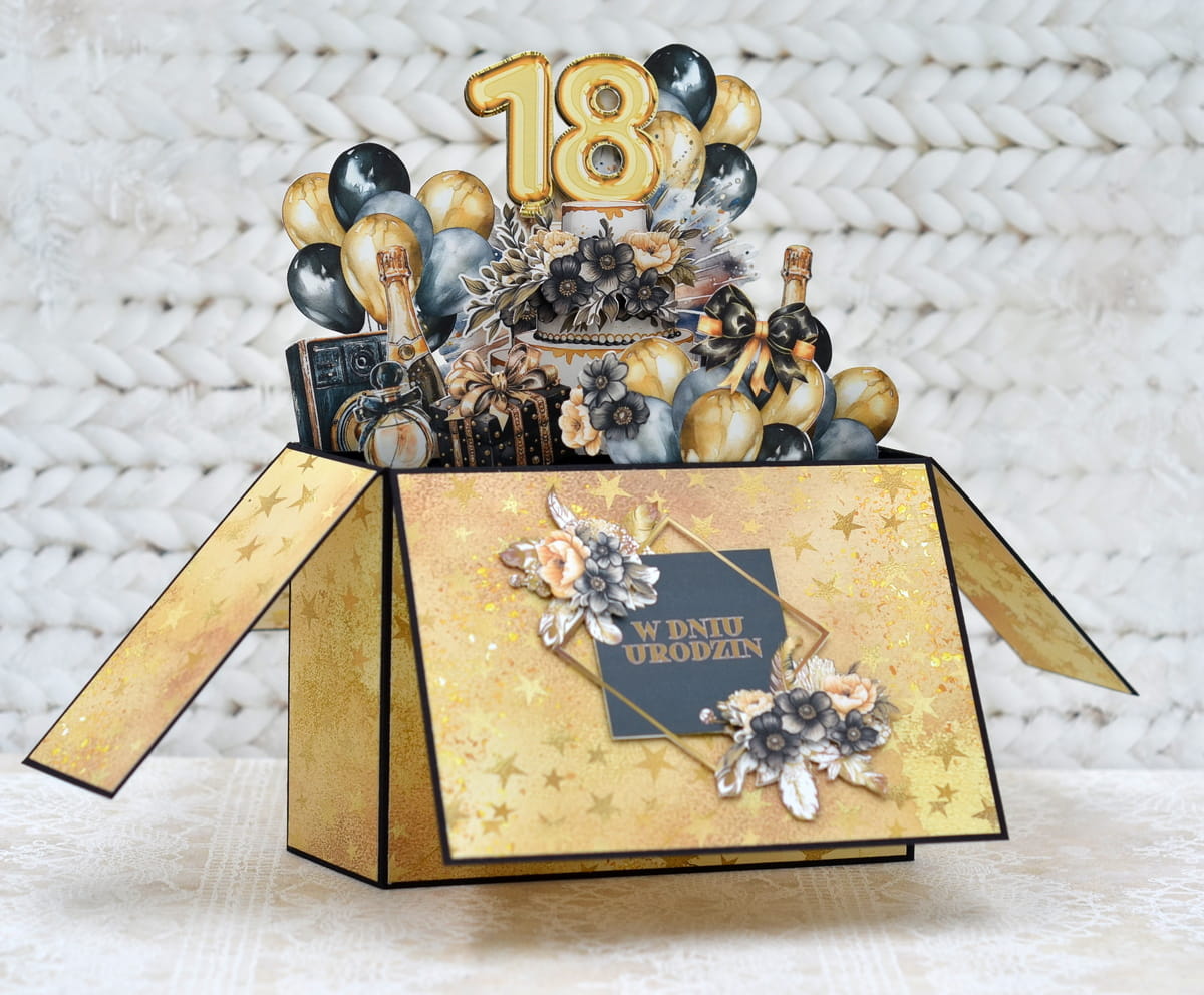 Zestaw materiałów miniKIT scrapbooking kartka na 18 urodziny pop up box zawiera: