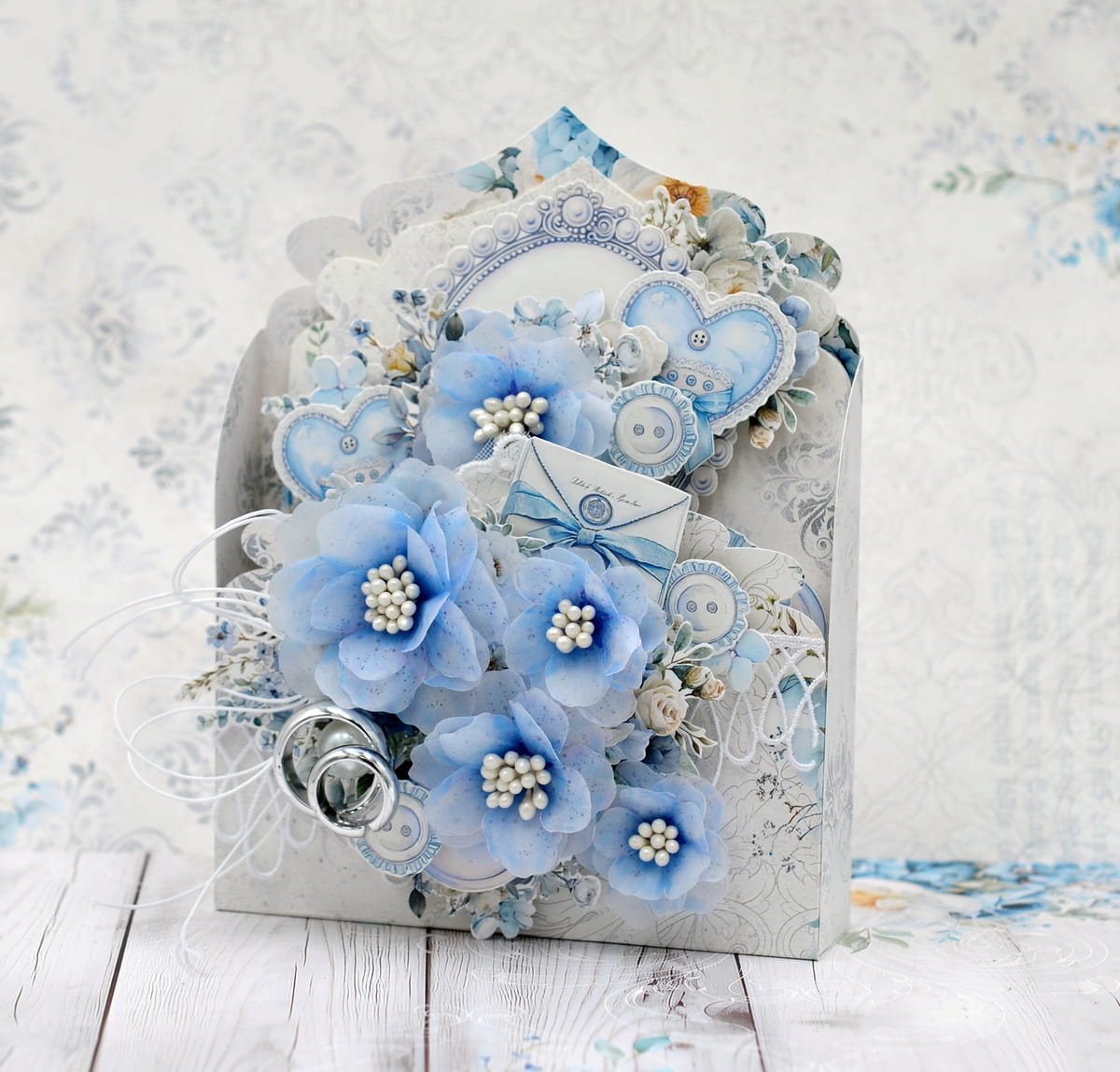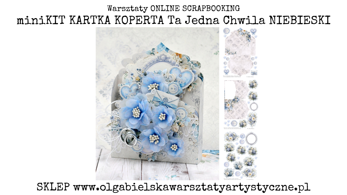 miniKIT zawiera materiały do wykonania 1 kartki ślubnej KOPERTY 3D z kolekcji Ta Jedna Chwila NIEBIESKI: